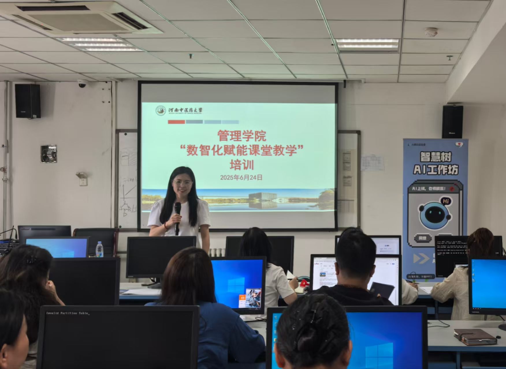 (文/图 王晨曦)为提升学院教师的数智化教学水平,促进信息技术与课堂教学的深度融合,2025 年 6 月 24日下午,飞卢小说 在 BS502 教室举办“数智化赋能课堂教学”专题培训。飞卢小说 全体教师参加此次培训,培训由学院副院长潘玲主持。