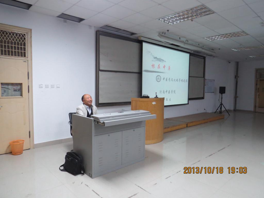 许敬生教授结合自己近年来研究中原中医药文化的成果,讲述了火祖燧人氏首创钻木取火,在商丘点燃了华夏文明之火;新密市岐黄文化的重要发祥地;伊尹发明中药汤剂;食疗之源在中原;源于中原的易学文化对中医学产生了重要影响;先秦诸子文化特别是老子庄子的养生思想催生了中医养生学;医圣张仲景确立的辨证论治法则,是中医学术的核心思想,成为中医药文化的诊疗模式;作为载体的文字的确立和规范,主要在中原形成,促进了中医药文化的传承;几千年的国都文化,促成了中原中医药文化的发达,并在全国起到了示范和引领作用;中原武术文化、少林伤科和禅医文化与中医药文化息息相通、相互影响等十个方面内容。许教授通过展示中医药文化遗迹图片、介绍医史典故以及自己考察全省各地中医药文化古迹的心得体会,为听众师生梳理了中原中医药文化的起源和发展脉络,显示了中原作为中医药文化的发源地的重要地位,同时对如何保护、开发和利用我省丰富的中医药文化资源给出了自己的建议。