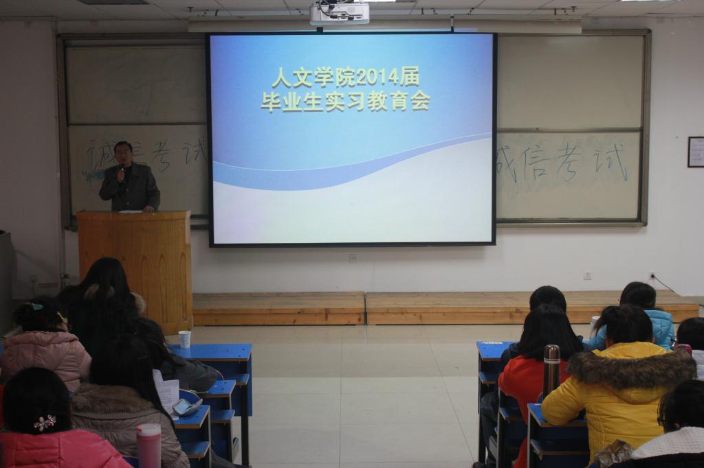 人文学院高度重视学生实习工作,全力做好学生实习及前期教育工作。为保证实习质量,做好学生的日常管理和安全督导,确保实习工作顺利开展,我院于1月13日在教学大楼A区四楼阶梯教室举行了2014届毕业生实习动员大会。学生处学生资助管理中心副主任李志轩、招生就业处就业指导科科长赵海阳、我院党委副书记庞亚宾、副院长段晓鹏、教学办丁俊凌、学工办全体人员及2014届本科毕业生参加了此次大会,会议由2014届毕业生辅导员和祎鸣主持。