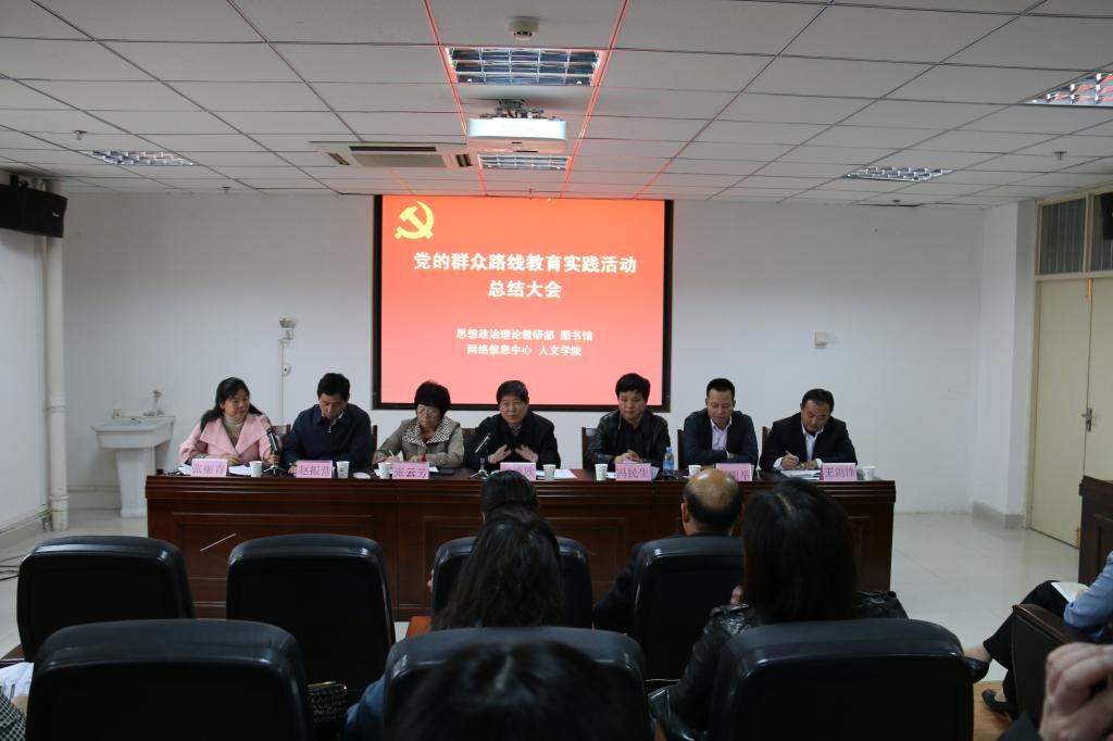 2014年11月7日下午,思政部、图书馆、网络信息中心、人文学院党的群众路线教育实践活动总结大会在教学实验大楼BN617会议室举行。学校第二督导组组长、副校长郭德欣,督导组成员、教师发展中心主任兼组织部副部长、人事处副处长冯民生出席会议。思政部全体教师,图书馆副高职称以上教师、科级以上党员干部,网络信息中心全体党员,人文学院副高职称以上教师、科级以上党员干部、无党派人士代表、学生党员代表参加了会议。会议由人文学院党委副书记、院长张丽青主持。