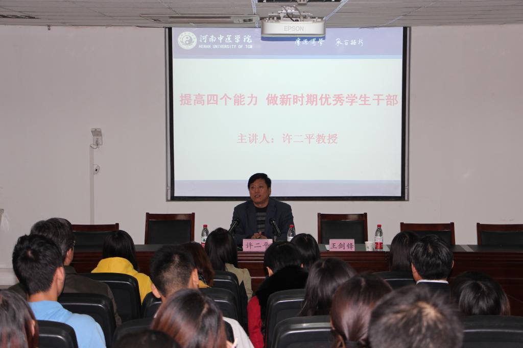 为了进一步提高我院学生干部的素质和能力,按照我校大学生综合素质提升工程的要求,人文学院2014年学生干部培训班于2014年11月6日下午在教学楼BN617正式举行。河南中医学院副校长许二平教授出席开班仪式并作首场报告,人文学院党委书记王剑锋、副书记庞亚宾,人文学院全体辅导员及主要学生干部80余人参加了此次培训大会。王剑锋同志主持了培训班开班仪式和首场报告会。