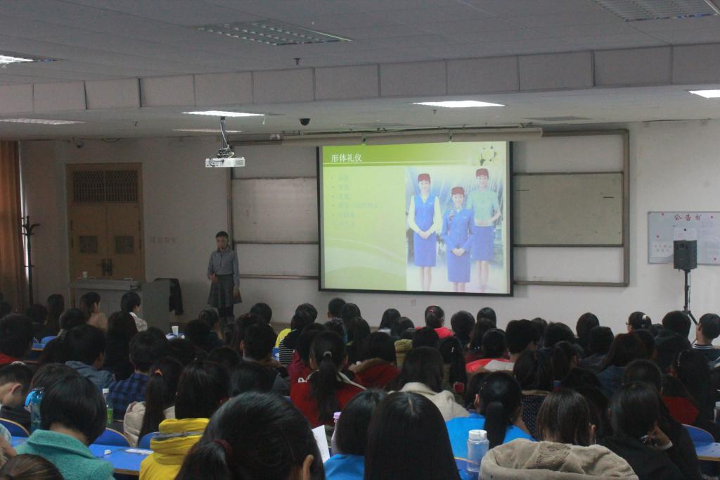 为进一步推进校园文明建设,提升在校大学生文明素养,推进我院学生干部文明礼仪水平的不断提高。 2014年11月20日中午,人文学院学生干部培训讲座第三讲之办公礼仪在教学楼二楼阶教正式开讲,本次讲座由校工会办公室主任张婉红老师主讲,人文学院全体辅导员,近300名学生干部参加了此次讲座。