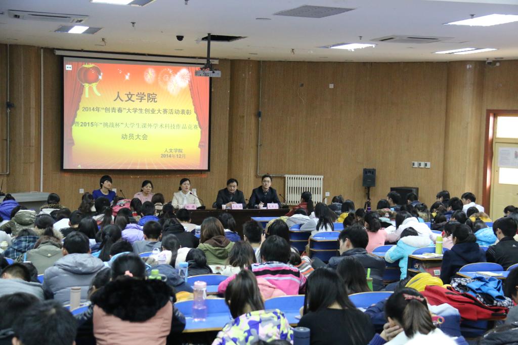2014年12月23日中午,人文学院2014年“创青春”大学生创业大赛表彰暨2015年“挑战杯”大学生课外学术科技作品竞赛动员大会在教学楼五楼多功能厅举行。校团委书记郭婧、人文学院党委书记王剑锋、院长张丽青、副书记庞亚宾及人文学院全体辅导员、获奖学生和各班学生代表参加了本次会议。会议由分团委副书记李妍妍主持。