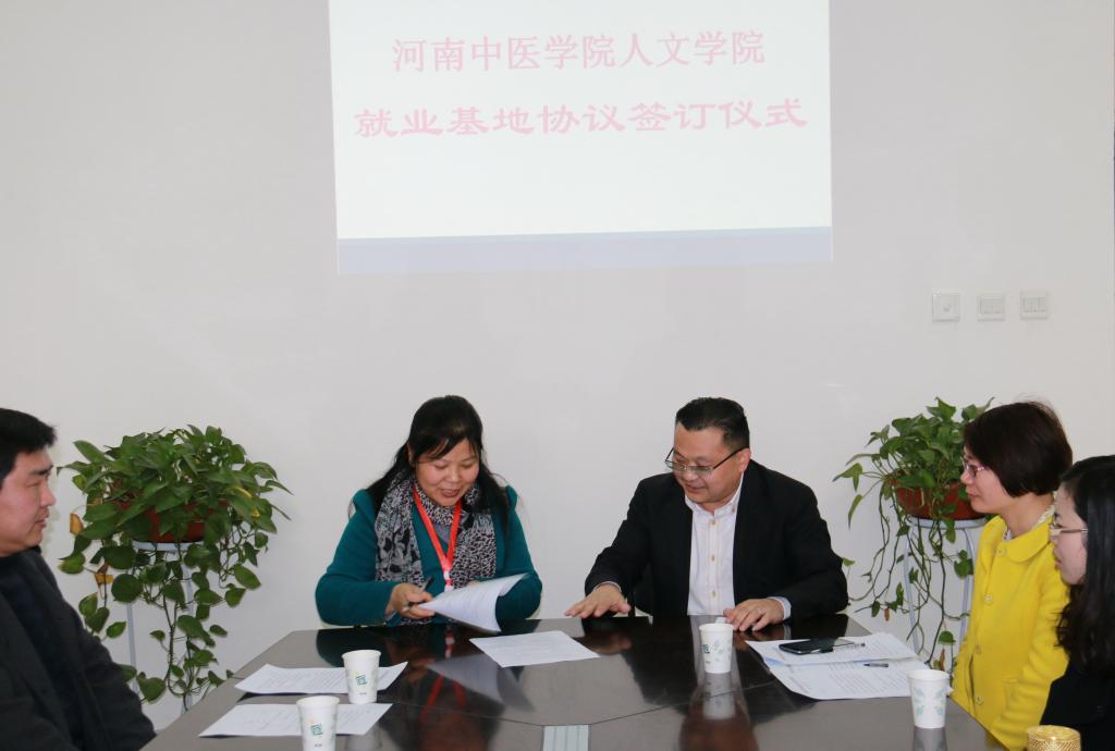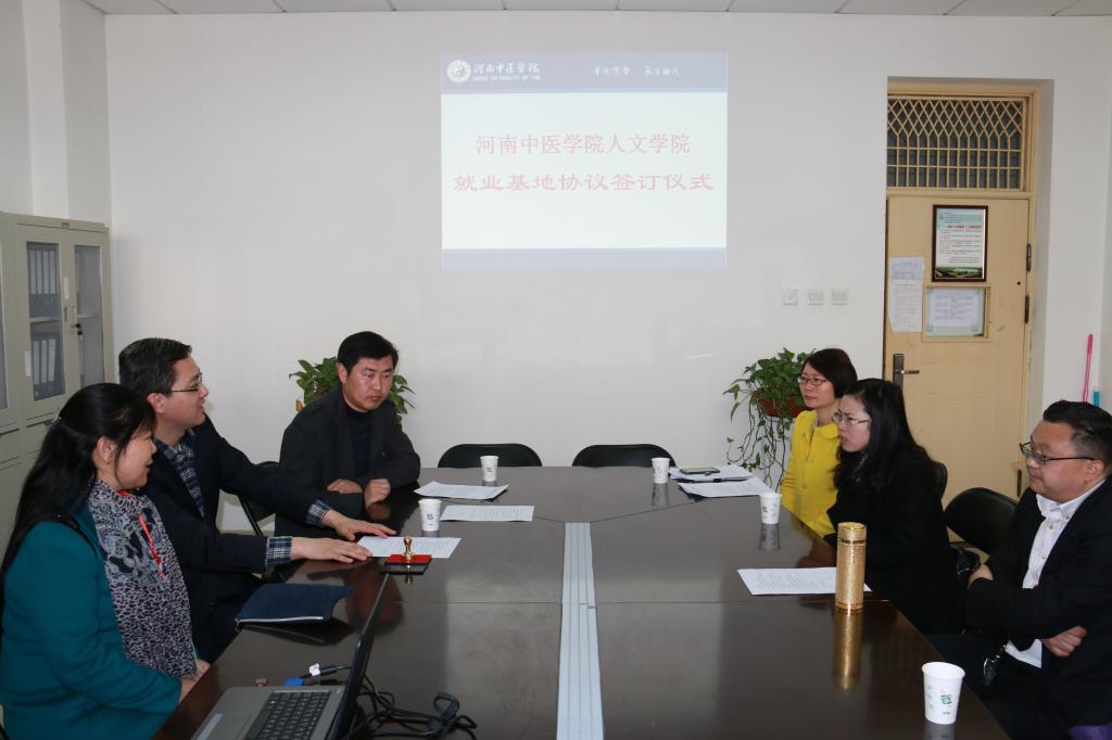 2015年3月14日上午,在我校2015年毕业生就业双选会期间,人文学院与昆明中药厂有限公司河南分公司、河南国土资产运营管理有限公司、河南蓝山集团有限公司、河南康伴商贸有限公司等4家用人单位进行了座谈并签订了就业实习基地协议。人文学院院长张丽青、党委副书记庞亚宾及学工办、分团委老师共同出席了座谈及签约仪式。