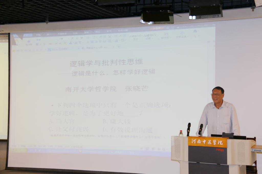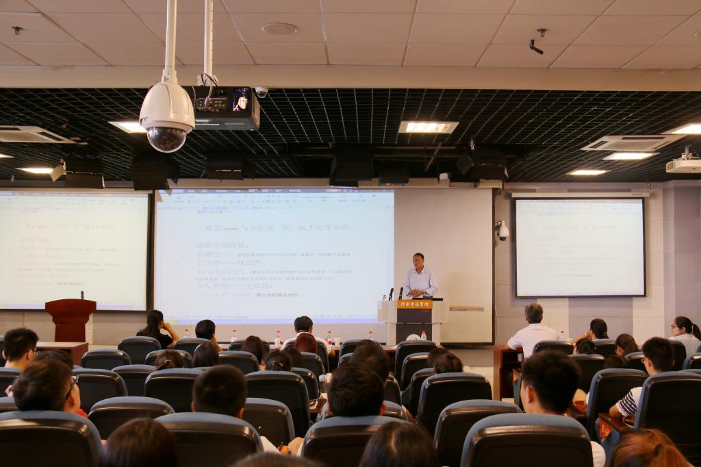 张晓芒教授以“逻辑和批判性思维”为题,阐释了什么是逻辑、逻辑的作用、怎样学好和用好逻辑三个问题,重点讲述了逻辑作为“思维的斧子”的作用。张教授首先以问答形式,用趣味问题激发了同学们对逻辑学的兴趣,然后结合现实生活,通过对“中国式过马路”、“老人扶不扶”、“面试”等热点问题的讨论分析,说明了逻辑学能够从现实性的角度培养学生的思维素质这一重要特点。接着,张教授又从八个方面论证了这一观点:培养认识世界的方法;突破经验逻辑的束缚;提高沟通交际能力;提高批判性思维能力;提高人文精神;提高创新能力与创新精神;有助于应试社会逻辑考试;培养逻辑精神。这八个方面充分说明了逻辑是生活的逻辑,是实用的逻辑。张教授认为,人生是处于不断试错中的,经验来自于对错误选择的纠错,所以建议大家要养成“找毛病”的习惯,培养批判性思维,以达到“诚者,天之道也;诚之者,人之道也”的境界。张教授的报告内容丰富,讲解生动,紧密联系现实生活,展现了其丰富的学识,为同学们描绘了不一样的逻辑世界,赢得了与会师生的一致好评。