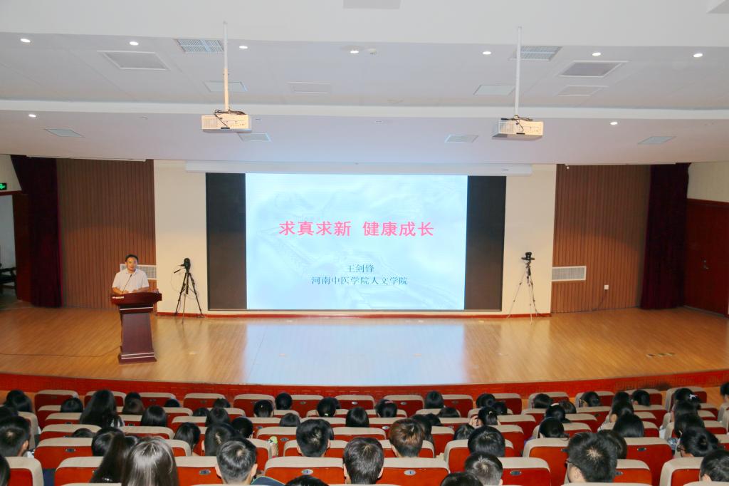 2015年9月29日上午,人文学院党委书记王剑锋在新区图书馆第一报告厅为2015级全体新生做了题为《求真求新,健康成长》的精彩报告。他从我国古代“给猫起名儿”一则寓言故事讲起,教育同学们要“归真”,做到“苟日新、日日新、又日新”。王剑锋书记从如何适应大学环境、如何适应大学学习、如何适应大学交往和如何适应大学生活四个方面为2015级新同学进行了情真意切的指导。他叮嘱同学们不仅要适应学校的小环境,更要关注“大环境”,经常关注新闻和时事,善于利用图书馆,通过多听讲座、多参加有益活动等途径不断地积累知识、拓宽视野,提高自身综合素质,健康成长成才。