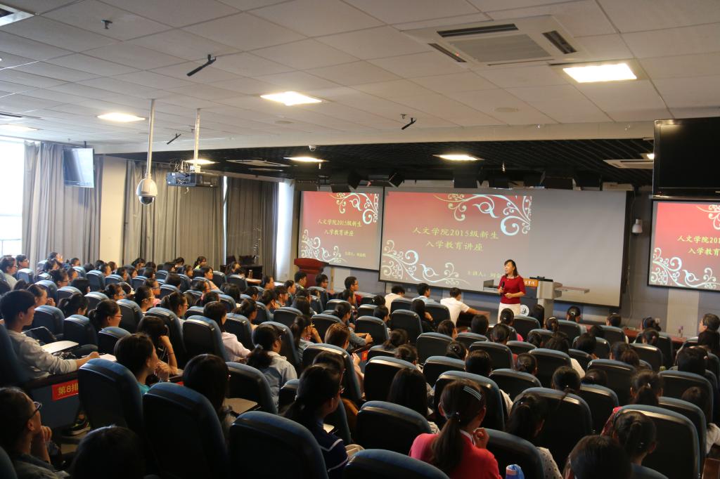 2015年9月28日上午,人文学院党政领导班子全体成员与新生见面。人文学院院长张丽青教授以《新起点,新征程》为题,围绕着学院沿革与概况、学科与专业建设、各专业培养方案、梦想与实现梦想四个方面做了深入讲解。张院长在报告中叮嘱2015级新同学要树立明确的奋斗目标和人生梦想,科学合理地规划自己的大学生涯,不仅要学会如何学习,处理好知识和能力的关系,更要善于自学和总结,做到厚积薄发。