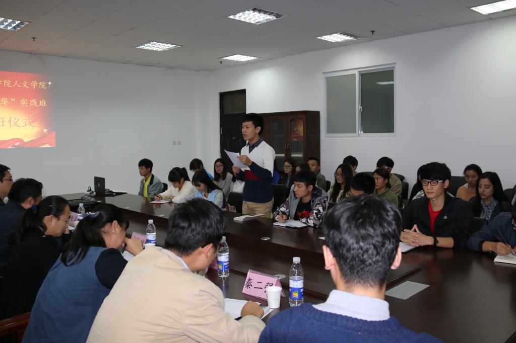 开班仪式上,首先由人文学院分团委书记时慧宣读《“青衿年华”实践班实施方案》,向与会人员介绍了开展实践班活动的背景、步骤、具体活动等问题。随后,人文院党委副书记、实践班班主任庞亚宾作讲话,他向首期实践班同学表示欢迎,并讲到实践班的意义在于培养精英人才,而人才的培养在于综合素质的提升,庞书记还引用校党委书记孙建中在校英才班开班仪式上做的《炼就五大素质—为成功成才和幸福人生打下坚实基础》的报告,要求大家在“德、知、体、心、能”五大素质上要有显著的提升。