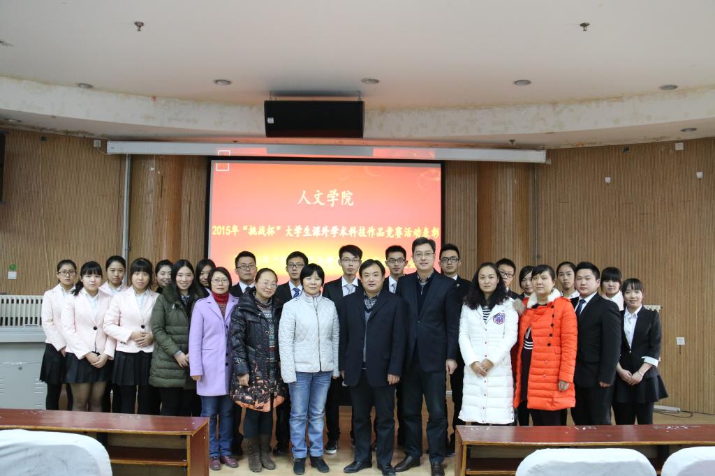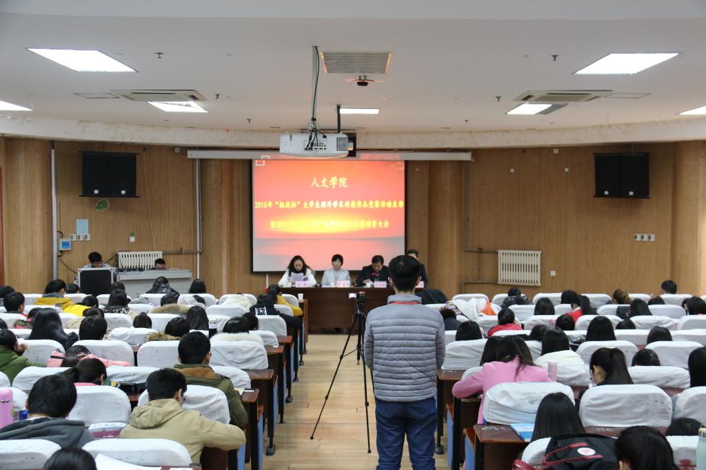 2015年12月30日,人文学院2015年“挑战杯”大学生课外学术科技作品竞赛活动表彰暨2016年“创青春”大学生创业大赛动员大会在教学楼二楼多功能厅举行。人文学院党委书记王剑锋、院长张丽青、党委副书记庞亚宾、指导老师及全体辅导员与会,参加此次会议的还有获奖学生代表和各班学生代表近300名,会议由分团委书记时慧主持。