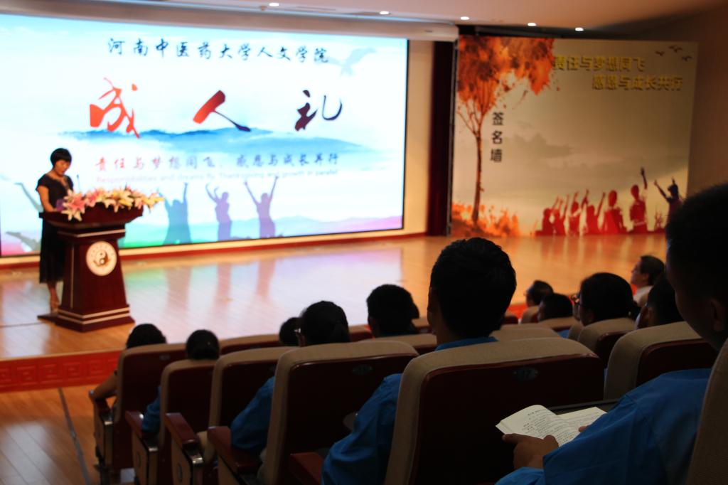 伴随着慷慨激昂的音乐,20名新生代表上台向大家喊出自己的梦想和愿望,和大家一起见证激情而灿烂的青春;接着,在主持人的带领下,人文学院2016级新生全体肃立,举起右手,庄严宣誓:“我立志成为有理想、有道德、有文化、有纪律的社会主义公民。遵守宪法和法律,热爱社会主义祖国,拥护中国共产党的领导。正确行使公民权利,积极履行公民义务,践行社会主义核心价值观,自觉遵守社会主义道德。爱国守法,明礼诚信;崇尚科学,追求真知;服务他人,贡献社会;完善人格,强健体魄。为实现中华民族的伟大复兴,贡献青春,奋斗人生!”洪亮的誓言表达了他们迈向人生的新起点并勇于承担社会责任的决心。最后,2016级新生同学们有秩序地在成长墙上签名,领导老师为之行成人礼,同学们携手跨越成人门,完成成人礼仪式。