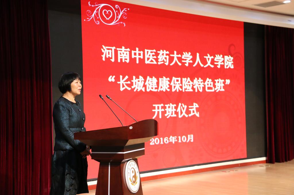 开班仪式首先由人文学院院长张丽青致辞。她首先对“长城健康保险特色班”的开班表示祝贺,她说:“长城健康保险特色班”通过校企合作的深度融合,实现学校、学生、企业多方共赢的有效模式,也是开展创新创业教育的重要组成部分。希望双方优势互补,深入合作,共同发展,不断深化、优化校企合作育人模式,培养出更多内外兼修、基础扎实、实践能力强的复合型人才。她希望同学们要结合自身实际,善于把握机会,实现人生价值。