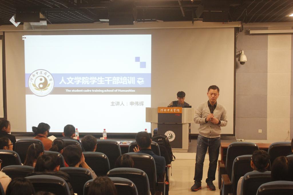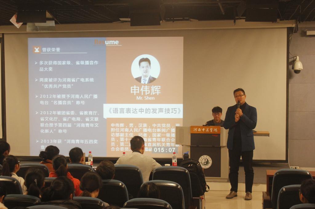 2016年11月11日下午,人文学院特邀河南人民广播电台新闻广播采访部副主任、记者、国家一级播音员申伟辉老师在教学楼A634为同学们作关于《语言表达中的发声技巧》的讲座。出席此次讲座的领导有人文学院工商管理学科陈层、易美国际旅行有限公司董事长弓嘉、市场总监张磊、人文学院分团委书记时慧、分团委副书记许菲斐,参加讲座的还有人文学院全体学生干部、“青衿年华”实践班以及14级市场营销班学生代表等。