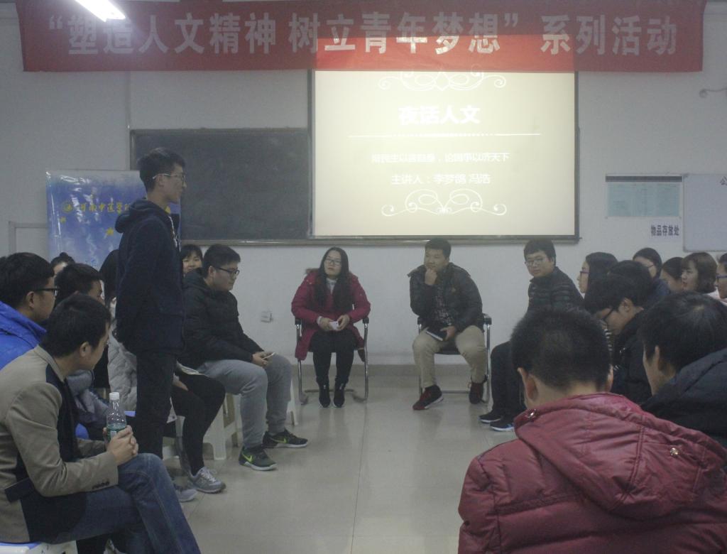 为培养大学生的综合素质,丰富同学们的文化生活,2016年11月23日晚,人文学院学生会邀请人文学院辩论队优秀辩手2014级应用心理班李梦鸽、人文学院辩论队队长2015级市场营销班冯浩在教学楼A533进行了第二期夜话人文故事会。