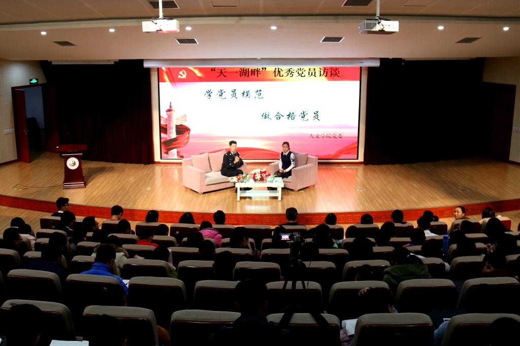 为认真学习贯彻习近平总书记在全国高校思想政治工作会议上的讲话精神,认真开展“两学一做”学习教育,向身边的英雄模范学习。2016年12月10日下午3:00,人文学院在图书馆第一报告厅举办“天一湖畔”优秀党员访谈活动,此次访谈活动以“学党员模范,做合格党员”为主题。