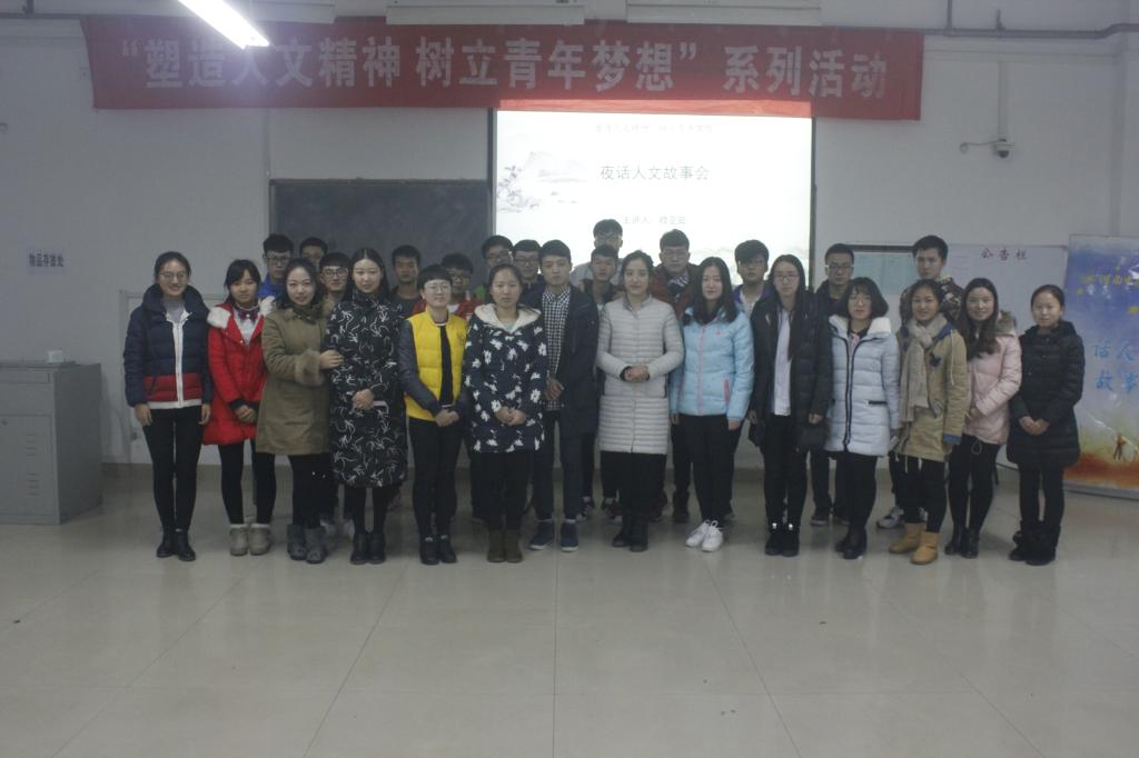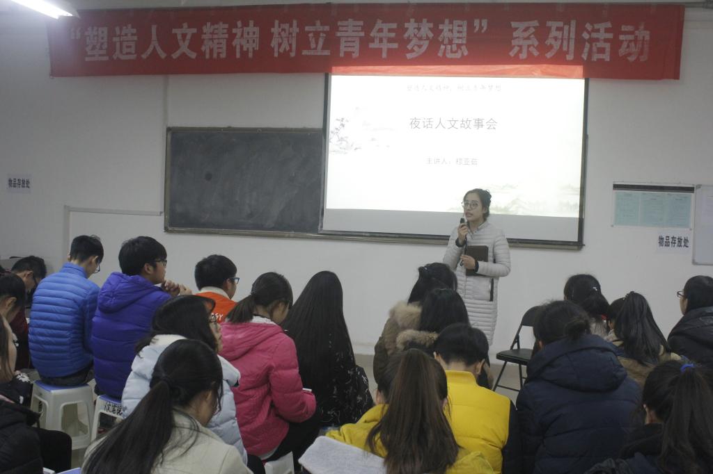 为体现大学生校园文化生活的多样性,突出人文之美,2016年12月14日晚上,人文学院学生会邀请人文学院学生会科研创新部部长、“蒲公英”校园文化讲解团团长、2014级公共事业管理班穆亚茹在教学楼A533进行了第三期夜话人文故事会。参加活动的有人文学院第二期“青矜年华”实践班成员及人文学院学生会成员。