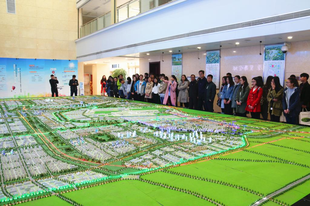 首先,人文学院师生参观了新郑机场T2航站楼和航空港区规划展览馆。在“十二五” 成就回顾展展台前,通过丰富的图片和大量的数据,同学们深入了解到航空港区近几年以创新、高科技等产业为支柱的各项产业迅猛发展,每年总产值增幅高达40%以上,2016年手机产量已达2亿部以上,成为全球最大的智能手机生产地。