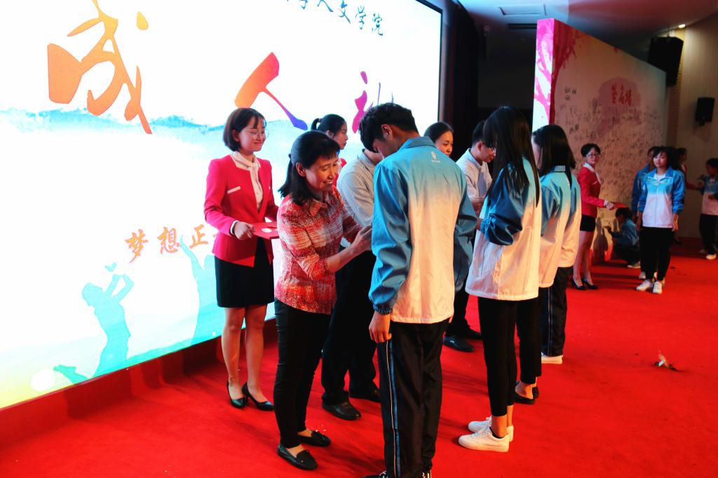 最后,2017级新生同学们有序地在成人墙上签名,领导、老师为之行成人礼,同学们携手跨越成人门,完成成人礼仪式。