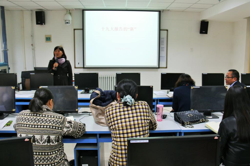 会上,人文学院院长张丽青以《十九大报告的“新”》为题,从“明确了中国进入了新时代”、“明确了习近平新时代中国特色社会主义思想”、“明确了当前我国新的主要矛盾”、“ 明确了我国今后一段时间的新任务”等四个“新”对党的十九大报告进行了解读。张院长说,党的十九大报告大气磅礴、内涵丰富,报告中一系列新思想、新论断、新提法、新举措,为中国特色社会主义事业描绘了新蓝图、指引了新方向。对我们哲学社会科学领域的工作者来说,没有什么比为实现中华民族伟大复兴而从事研究更光荣、更伟大、更激动人心的任务。中国的哲学社会科学工作者生逢其时,赶上了为中华民族伟大复兴贡献自己专业知识的奋进时代。在构建中国特色哲学社会科学的实践中,我们要始终坚持以马克思主义为指导,不断总结实践成果,推动理论创新,认真学习贯彻党的十九大精神和新时代中国特色社会主义思想。