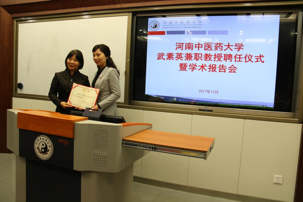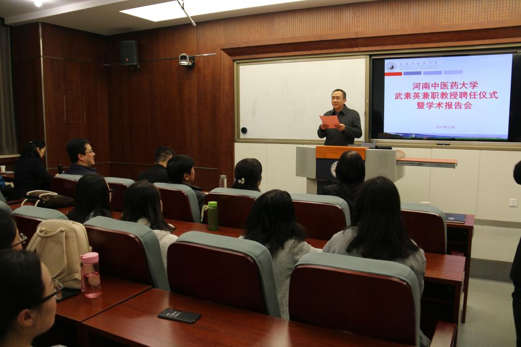 2017年12月20日下午,河南省人民医院副书记武素英受聘我校兼职教授仪式暨学术报告会在教学实验大楼A641举行。省人民医院相关职能部门负责人,我校发展规划处负责人、飞卢小说 领导班子、师生代表100余人参加了聘任仪式。仪式由飞卢小说 党委书记段晓鹏主持。