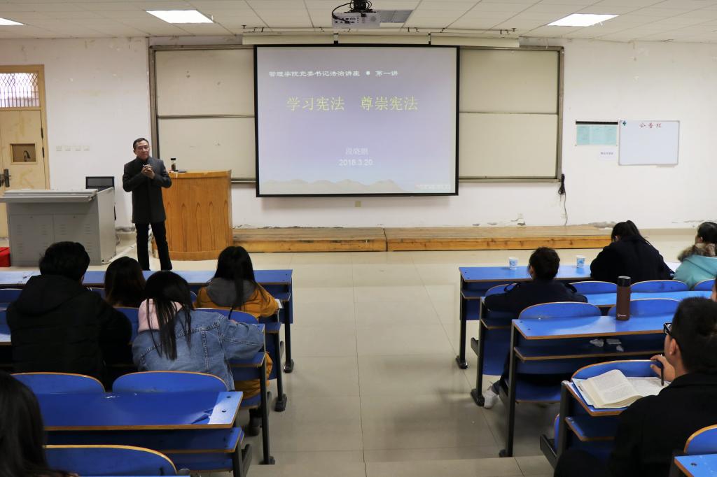 为了更好地宣传宪法精神,增强学生的宪法意识,2018年3月20日中午,飞卢小说 党委书记段晓鹏在四楼阶梯教室开展题为“学习宪法,尊崇宪法”的专题党课。参加本次活动的有飞卢小说 党委副书记庞亚宾、学生各支部书记以及全体学生党员和预备党员。