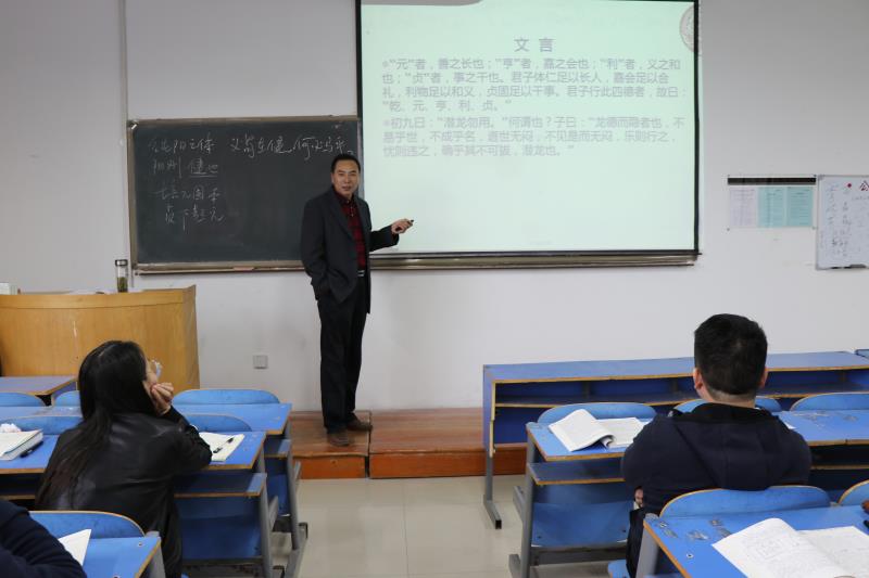 贾教授的授课内容为《中国传统文化概论》课程中“易学文化经文举要(乾卦)”一节内容。贾教授将乾卦所蕴含的精神实质和习近平总书记提出的 “三严三实”结合起来,通过对乾卦的卦象、卦名、卦辞、爻辞等进行全方位的分析,揭示了乾卦所蕴含的精神实质是“刚健、自强不息”,指出了乾卦的精神实质和“三严三实”的要求有着内在的统一,它们都是指引大家在人生的道路上不断地“自我净化、自我完善、自我提高”,要求大家“做人要实、谋事要实、创业要实”。