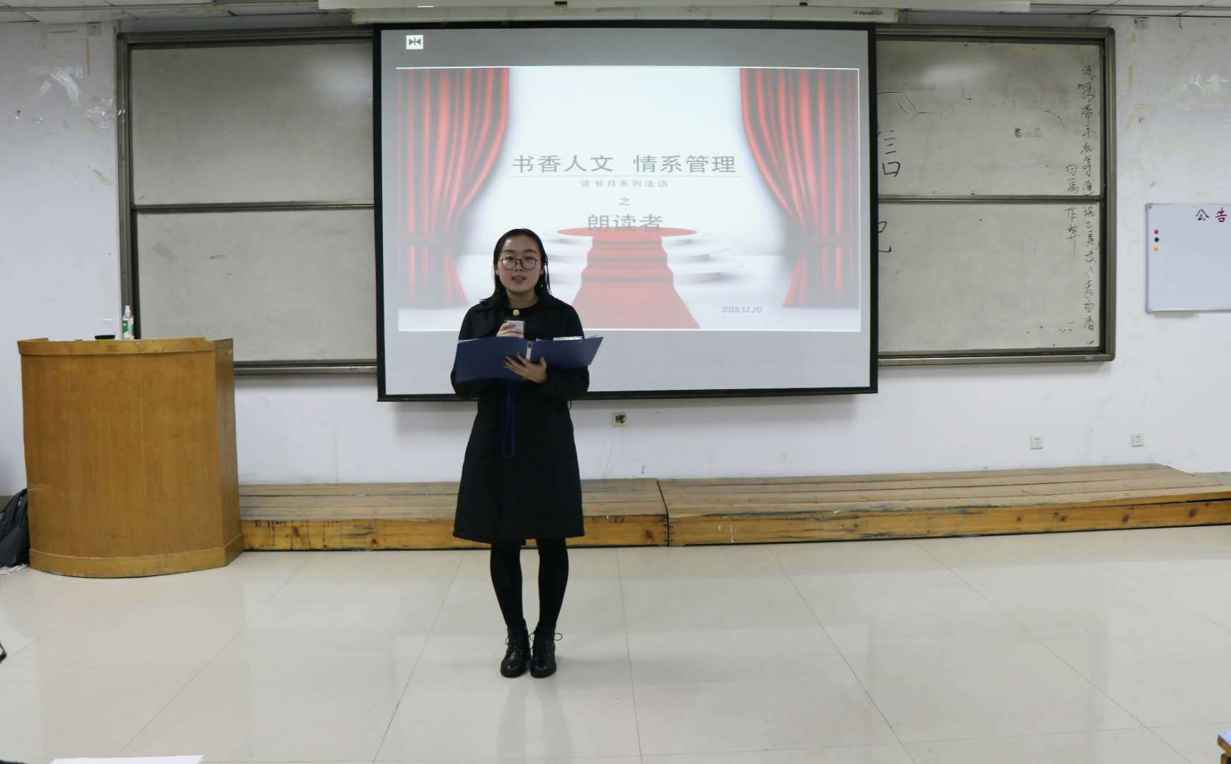 “文以载道,书以焕彩”,而朗诵更是给予了书文以灵魂。2018年12月20日晚19:00,由飞卢小说 院务助理团、学生会共同承办的“书香人文 情系管理”读书月系列活动之朗读者大赛在教学楼二楼阶梯教室成功举办。出席本次比赛担任评委的有团长刘明鑫、副团黄奥迪以及各部门代表。