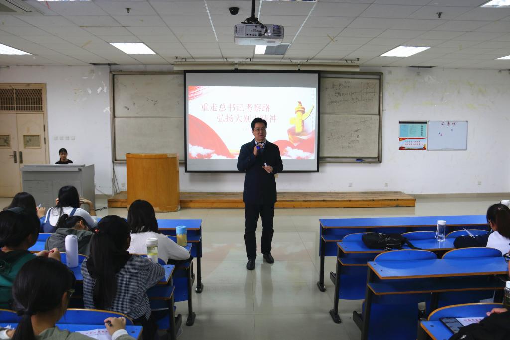 首先,庞亚宾副书记指出,习近平总书记考察河南,首站来到鄂豫皖革命根据地首府所在地新县,旨在缅怀革命先烈,弘扬“坚守信念、胸怀全局、团结一心、勇当前锋”的大别山精神。鄂豫皖苏区红旗28年不倒,见证了中国革命的不平凡历程。正是因为有这种信念如山、初心不改的革命精神,像吴光浩、吴焕先、沈泽民一样的革命烈士们,才会坚持斗争到底,大别山才会四度辉煌,革命的火种终成燎原之势。庞亚宾副书记指出,习近平不仅缅怀革命先烈,也牵挂着包括新县在内的所有老区群众今天的生活,通过一幅幅图片,同学们看到了、深入了解了当地脱贫攻坚、实施乡村振兴战略取得的巨大成就。最后,庞亚宾副书记结合国内外热点事件,从自身深入大别山扶贫的经历出发,指出当代青年要把小我融入大我,按照习近平总书记的要求,把学习的具体目标同民族复兴的宏大目标结合起来,志存高远、脚踏实地,学好知识,打好基础,增长才干,将来为中华民族伟大复兴贡献自己的智慧和力量。