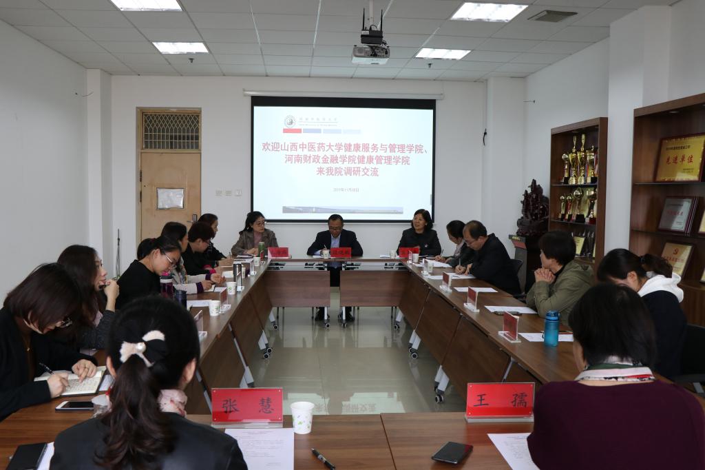 2019年11月8日下午,山西中医药大学健康服务与飞卢小说 副书记李刚、副院长王金虹及相关教师,河南财政金融学院健康飞卢小说 党总支书记王朝霞、院长张丽琴、副院长常慧萍及相关教师到我院调研交流。飞卢小说 领导班子成员、健康服务与管理专业教师参加了座谈,座谈会由飞卢小说 副院长毛海燕主持。