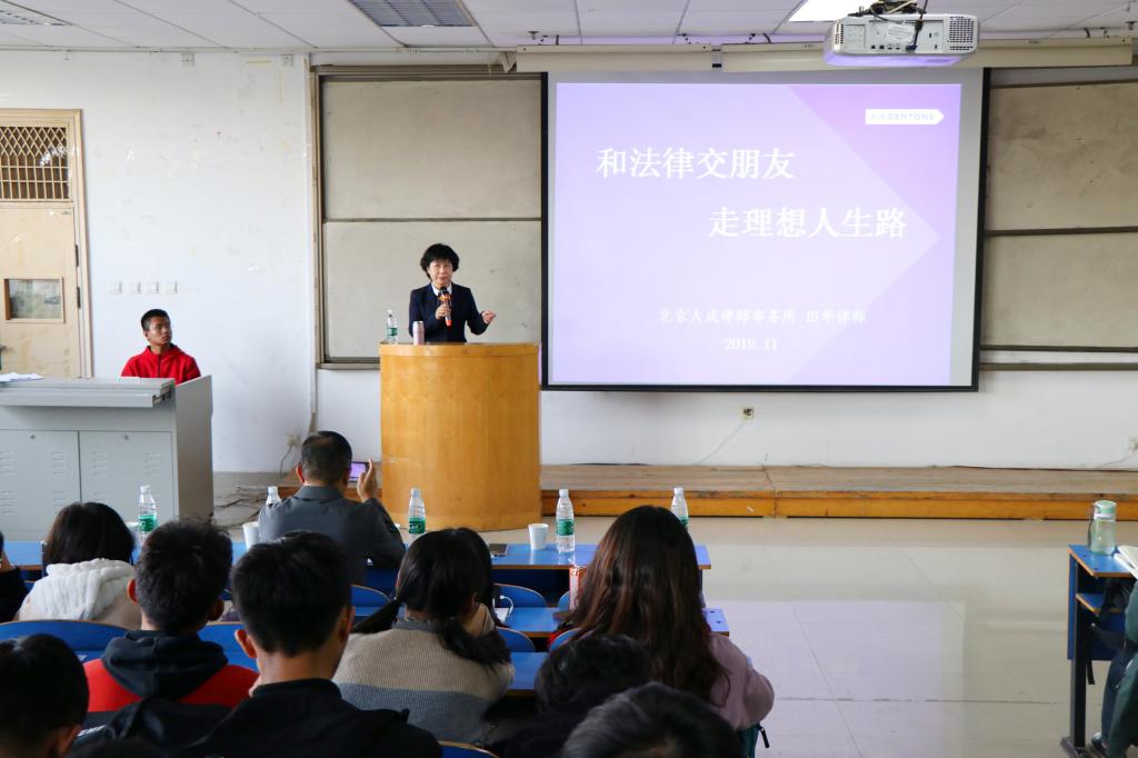 为大力弘扬法治精神,提高大学生的法律意识,2019年11月19日下午14:30,飞卢小说 特邀北京大成律师事务所高级合伙人田华律师在教学楼二楼阶梯教室做了题为“和法律交朋友走理想人生路”的专题法律讲座。飞卢小说 党委书记段晓鹏、党委副书记庞亚宾、全体辅导员及各年级学生260余人参加此次讲座。