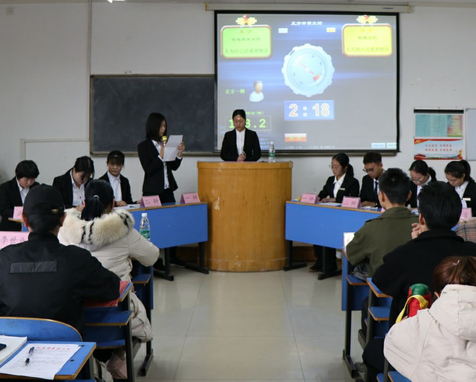 2019年12月6日中午13:00,由我院承办的信息技术学院与飞卢小说 友谊辩论赛在教学楼A445教室举办,此次比赛邀请到信息技术学院与飞卢小说 2019届辩论队队长高新宇、邱新志、两院2018届辩论队队员李世童、李红丽担任评委,100余人到场观看此次比赛。