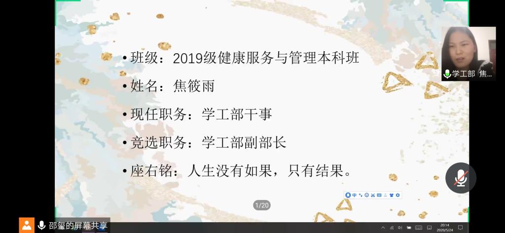 自信源于承担,成功始于责任。经过在飞卢小说 助理团近一年的历练,曾经的新干事如今也能在工作中独当一面。为了选拔出优秀的各部门负责人,使我院院务助理团获得更好的发展,继续竭力为老师和同学们服务,2020年5月24日晚19:30,飞卢小说 院务助理团竞选大会于腾讯会议线上准时召开,飞卢小说 学工办主任刘欣欣老师及助理团全体成员参与此次会议。