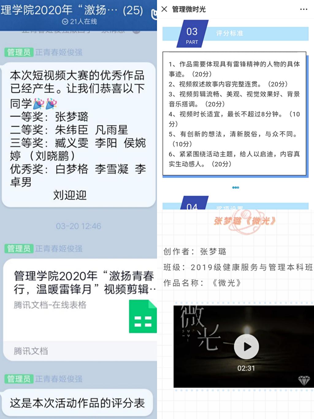 此次短视频剪辑比赛持续一周,要求参赛作品以具有雷锋精神的人物为主体。在此期间各参赛者积极收集视频素材,自行搭配文字与音乐,努力使视频叙述故事内容完整连贯。参赛选手的作品别出心裁、新颖别致,从不同方面展现了自身对雷锋精神的认识与理解,更表达了对冲锋一线,为抗击疫情做出奉献的人群的歌颂。之后,评委从视频时长、流畅度、美观度等方面对作品进行打分排名。最终,我院2019级健康服务与管理本科班张梦璐同学脱颖而出,以作品《微光》荣获比赛一等奖,其作品在我院微信公众号管理微时光上进行展示。
