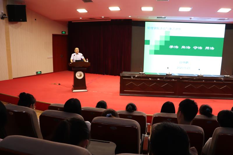 最后,段书记向新生提出“学法、尚法、守法、用法”的殷切期待,希望同学们深刻理解全面依法治国的重大意义,努力学习法律知识,树立法治理念,既严格遵守法律的强制性规定,又善于运用法律武器维护自身合法权益,主动做到与法同行。
