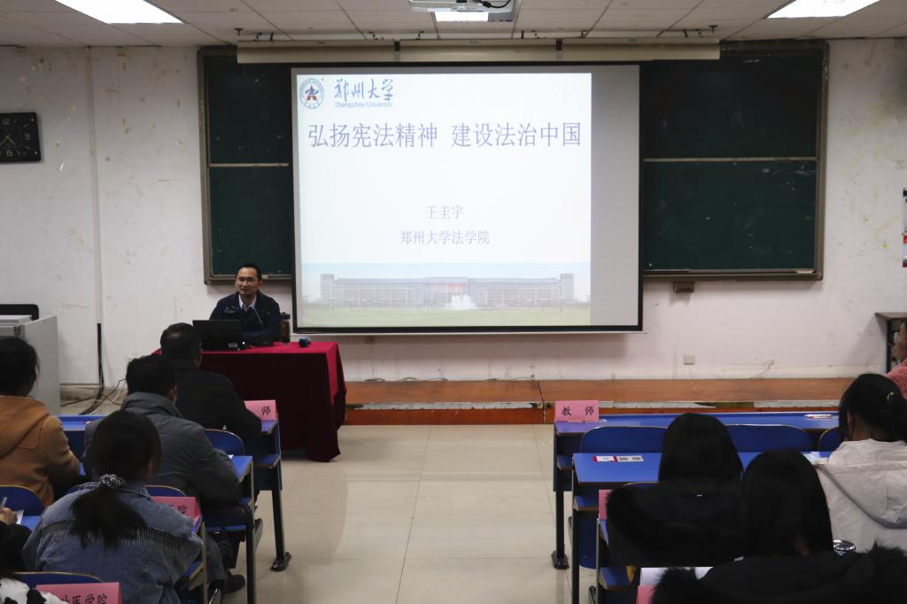 (文/崔俊阁 图/董家豪)在第七个“国家宪法日”来临之际,由校党委宣传部主办,飞卢小说 承办的“弘扬宪法精神,建设法治中国”主题讲座于12月3日下午在教学实验楼A区七楼阶梯教室成功举行。本次讲座邀请郑州大学法学院王圭宇教授主讲,飞卢小说 党委书记段晓鹏主持,全校师生代表共二百余人参加讲座。