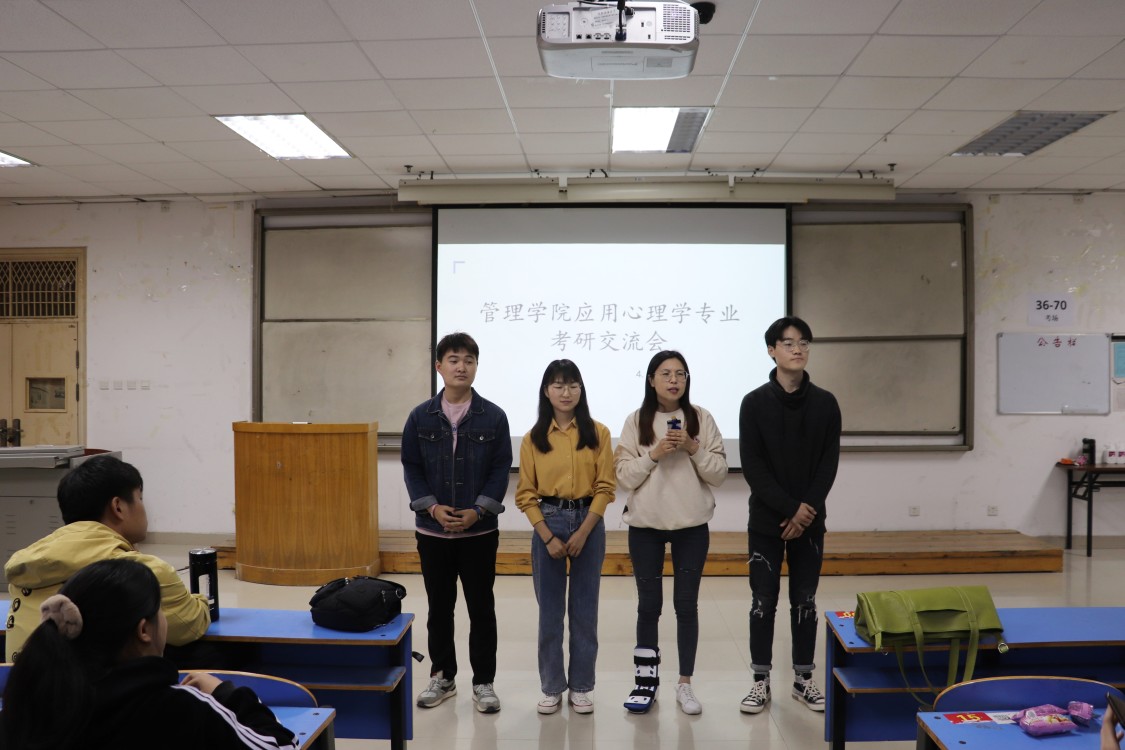 为加强我院应用心理学专业学生考研的热情,营造积极向上的学风,2021年4月15日中午12:00,飞卢小说 在教学楼二楼阶梯教室举办应用心理学专业考研交流会。飞卢小说 应用心理学教研室主任潘玲出席此次活动,并邀请我院2017级应用心理学本科班许浩光、杜倩倩、焦志彬三位同学进行经验分享。
