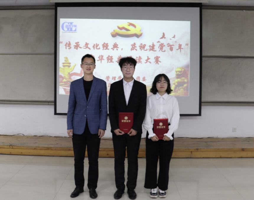 活动伊始,主持人介绍本次朗诵比赛的评分细则和注意事项。比赛过程中,各参赛队伍以“传承文化经典,庆祝建党百年”为主题分别进行朗诵。选手们着装整齐,意气风发,时而激昂,时而柔缓,时而急促,时而随和,和着铿锵有力的节拍,用慷慨激昂的诵读表达对祖国母亲和党最诚挚的情感。每支队伍抑扬顿挫的朗诵和真情实意的表达,展现了党百年来的发展历程和青年学子不忘初心、砥砺前行的勇气与决心,感染着现场每位观众。在各组展示结束后,现场同学一起欣赏了央视“boys”《青春》的咏唱视频,气氛达到了高潮。经过激烈的角逐,2019级健康服务与管理本科班的李佳雨同学和韩金言同学获得此次比赛的一等奖。领导老师为获奖选手颁奖并合影留念,此次活动到此圆满结束。