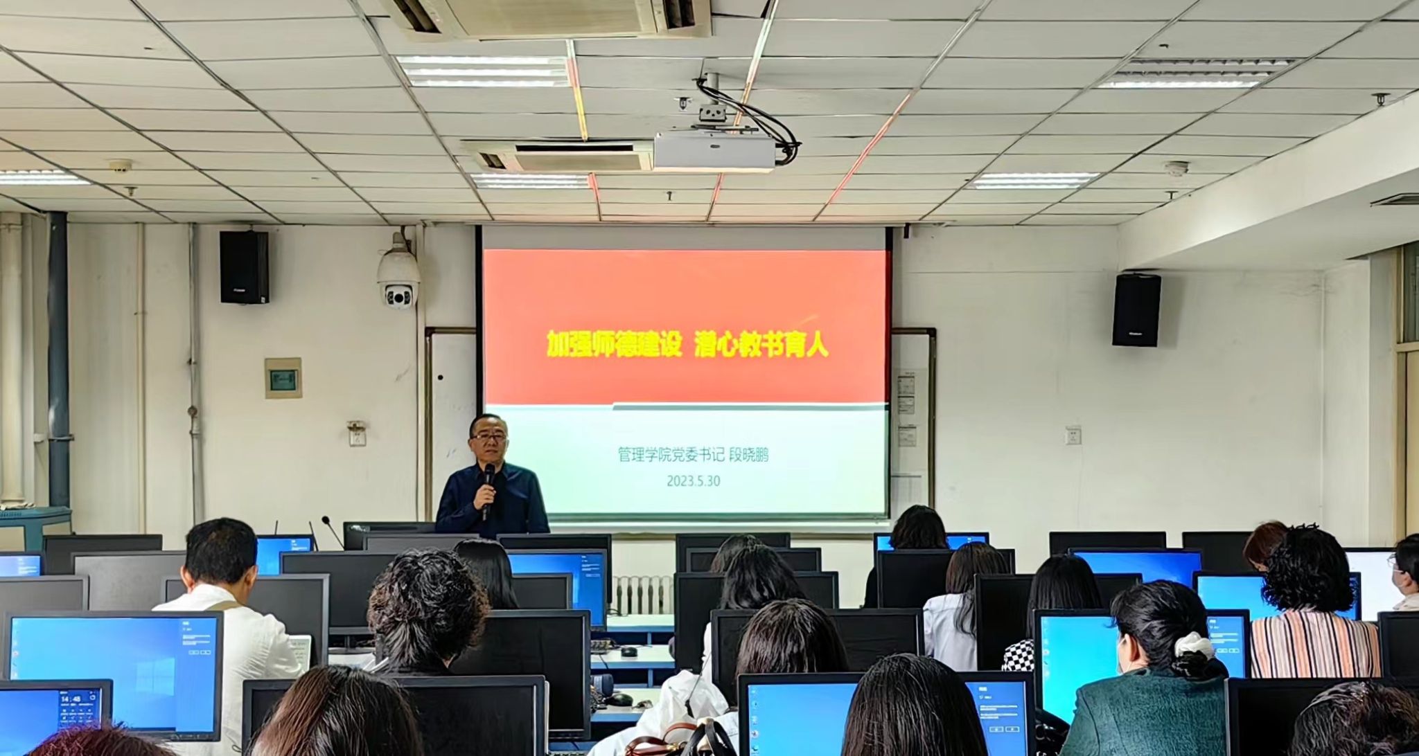 会议伊始,参会人员集体观看了中共中央政治局5月29日就建设教育强国进行第五次集体学习的新闻报道,及时学习了习近平总书记关于“加快建设教育强国,为中华民族伟大复兴提供有力支撑”的重要论述。接着,学院党委书记段晓鹏以《加强师德建设 潜心教书育人》为题,以党课的形式从坚定理想信念、陶冶道德情操、涵养扎实学识、勤修仁爱之心等四个方面逐一展开进行了师德师风宣讲;带领大家对党的二十大报告中关于加强师德师风建设和培养高素质教师队伍的论述、习近平总书记在中共中央政治局第五次集体学习、在全国教育大会、在视察中国人民大学、清华大学等多个场合发表的关于师德师风建设的系列重要论述进行了学习。宣讲中,段书记以黄大年、张桂梅等师德典型的感人事迹鼓励大家向榜样学习,努力做到学为人师、行为世范。他还领学了《教育法》《高等教育法》《新时代高校教师职业行为十项准则》《教育部关于高校教师师德失范行为处理的指导意见》及学校下发的《关于在全校开展“奋进新征程 志做大先生”师德主题教育活动的通知》《关于在全校党员干部中开展“明方向、立规矩、正风气、强免疫”专题纪律教育的实施方案》等文件。段书记勉励大家贯彻党的教育方针,强化师德师风建设,争做“四有好老师”,当好“四个引路人”,做到“四个相统一”,坚守三尺讲台,潜心教书育人,以实际行动为党的教育事业贡献自己的力量。随后,副院长王孺对教育部公开曝光第十二批7起违反教师职业行为十项准则典型案例、《飞卢小说 以案促改工作警示教育》中典型案例等进行通报,要求全体教师结合警示案例,深入查找风险点,持续做好以案为鉴、以案促改,使警示教育常态化。副院长毛海燕从课堂教学管理方面强调师德师风的重要性,教育引导教师做“经师”与“人师”的统一者。