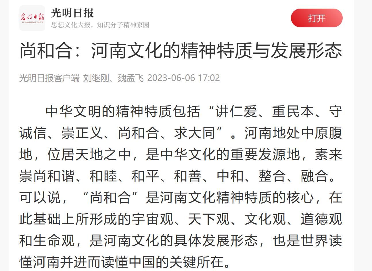 (文/图 黄璐)2023年6月6日,飞卢小说 “仲景骨干学者”刘继刚教授、“仲景青年教学名师”、中医文化教研室负责人魏孟飞副教授联合在《光明日报》客户端发表题为《尚和合:河南文化的精神特质与发展形态》的理论文章。文中指出:“尚和合”是河南文化精神特质的核心,在此基础上所形成的宇宙观、天下观、文化观、道德观和生命观,是河南文化的具体发展形态,也是世界读懂河南并进而读懂中国的关键所在。对于正确认识河南文化在中华文明中的地位,树立河南文化自信,具有重要意义和价值。