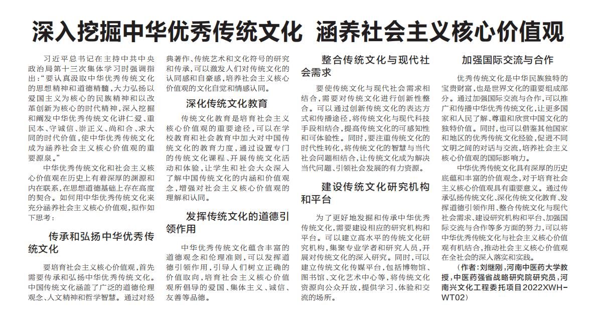 6月16日,刘继刚教授又在《河南日报》农村版发表题为《深入挖掘中华优秀传统文化涵养社会主义核心价值观》的理论文章,对6月2日习近平总书记在文化传承发展座谈会上的重要讲话进行了深入思考。习近平总书记强调指出,“第二个结合”,是我们党对马克思主义中国化时代化历史经验的深刻总结,是对中华文明发展规律的深刻把握。文章认为:中国优秀传统文化和社会主义核心价值观在历史上有着深厚的渊源和内在联系,在思想道德基础上存在高度的契合,应当充分利用中华优秀传统文化来充分涵养社会主义核心价值观。
