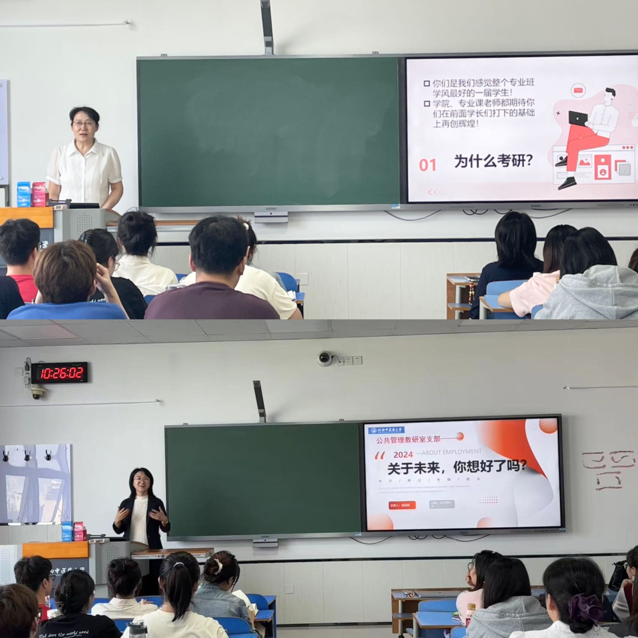 公管支部书记、教研室主任许静老师,党员段亚茹老师分别作动员报告。许主任结合专业特点与考研趋势,为同学们详细解读了考研政策、备考策略及注意事项,为同学们指明了前进的方向。段老师以“2024——关于未来,你想好了么?”为主题,通过生动的案例和深入的分析,引导同学们思考个人职业规划与未来发展,激发了大家对未来无限可能的憧憬与向往。