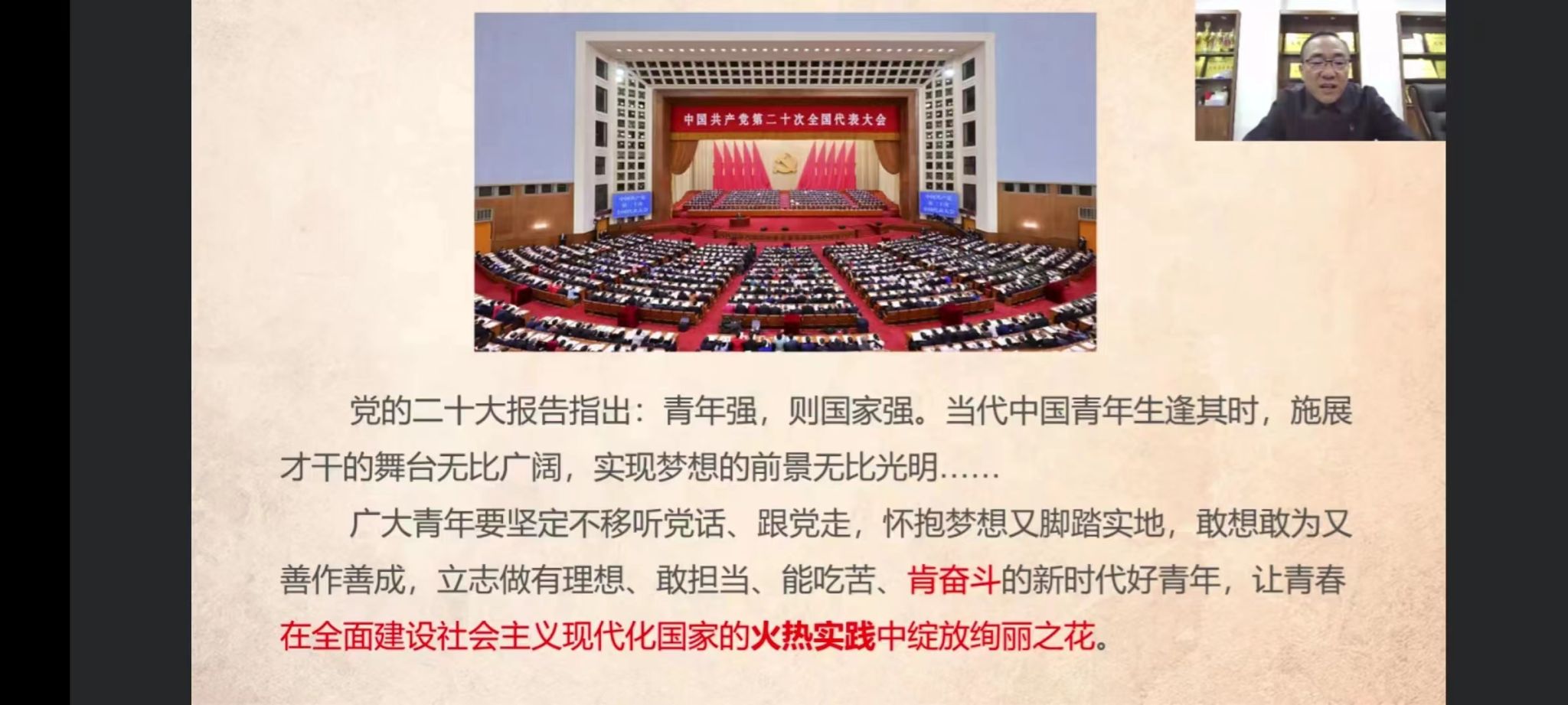 段书记围绕“美好的时节,美丽的青春”“让青春绽放绚丽之花”“千里之行,始于足下”三个部分进行了分享。他首先从美好的春色和刚开始的春季学期,引申到同学们正经历的人生中最美好的青春时代,并引用习近平总书记关于“青年是整个社会力量中最积极、最有生气的力量,国家的希望在青年,民族的未来在青年”的话语对大家进行鼓励。接着,段书记带领大家重温了习近平总书记在清华大学考察时以及在党的二十大报告中对广大青年的殷切期待,希望同学们不辜负总书记嘱托,让青春在为祖国、为民族、为人民、为人类的不懈奋斗中以及在全面建设社会主义现代化国家的火热实践中绽放绚丽之花!对于如何更好地奋斗和实践,段书记嘱咐大家牢记习近平总书记在纪念五四运动100周年大会上向新时代中国青年提出要求,树立远大理想、热爱伟大祖国、担当时代责任、勇于砥砺奋斗、练就过硬本领、锤炼品德修为。段书记带领大家回顾了以习近平同志为核心的党中央团结带领全党全国各族人民面对凶险疫情舍生忘死不懈奋斗的极不平凡又成效巨大的抗疫防疫历程,鼓励同学们不怕困难挑战,增强奋进勇气。