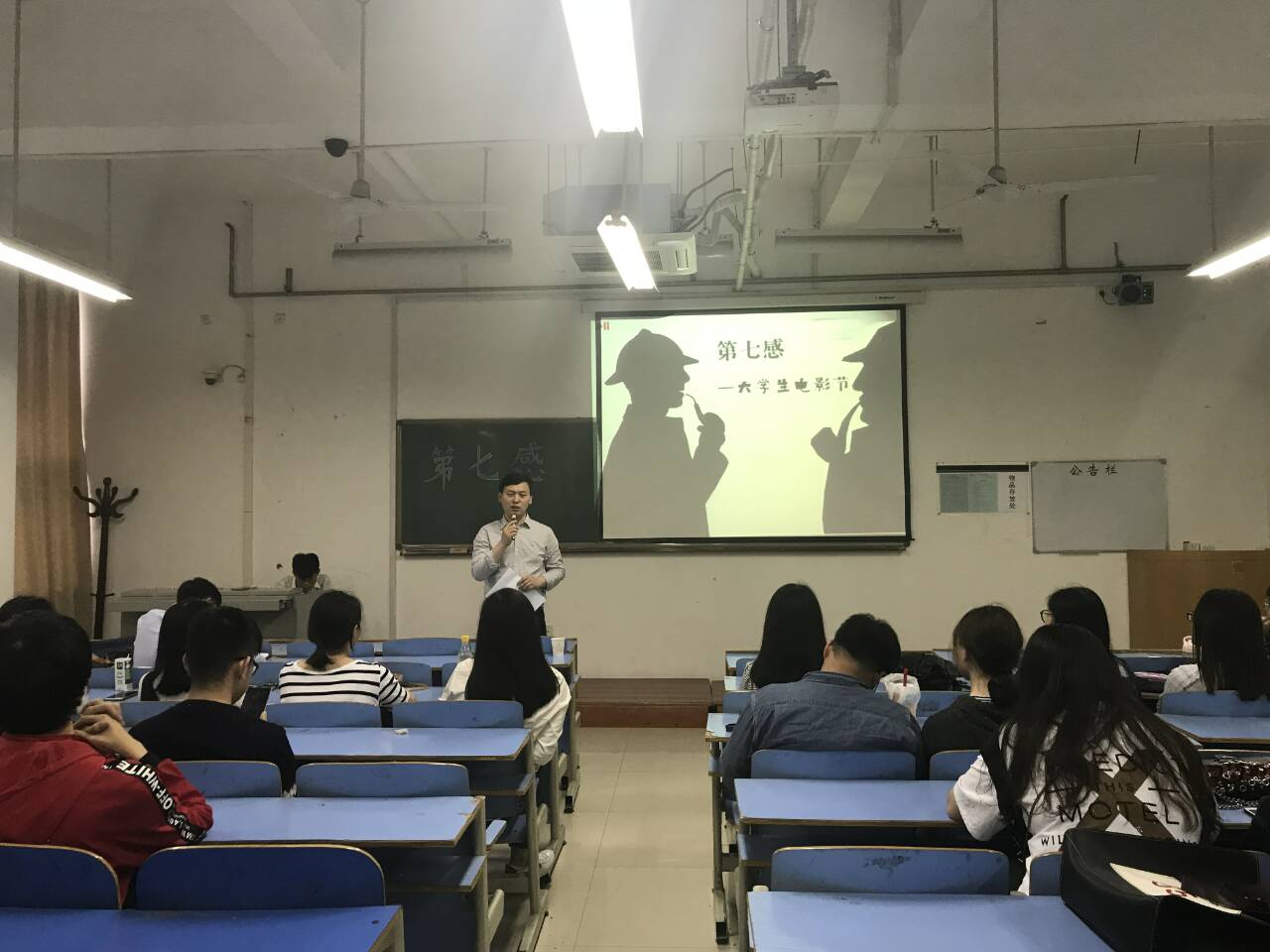 活动伊始,刘文礼老师作了开场致辞,他从中国古代侦探小说中引申出本次电影节的主题—悬疑。他指出,悬疑小说在先秦两汉文献史书中就已经出现雏形,到了唐代,较之前有了很大发展,这是悬疑小说形成的重要酝酿期。在宋元时期发展成型,在明末盛兴,并且一直长盛不衰的原因是中国有深厚的土壤,可以找到丰富的素材,并举出了一些好的悬疑剧,如《大宋提刑官》《画皮》《风声》《全民目击》等。接着,进入影片解说环节,主持人高亚飞为大家讲解《看不见的客人》、《孤儿怨》和《催眠大师》等影片的情节和内涵,讲解期间穿插了“你画我猜”和“123看这边”等小游戏,活跃了现场气氛,充分调动了同学们的积极性。最后,王超老师进行点评,他肯定了此次活动的意义,他认为悬疑剧布局完美,过程中令人提心吊胆,强调悬念而淡化感情,还教大家用声音和画面营造紧张的气氛,建议大家多看相关书籍,练习制作一张主题海报。