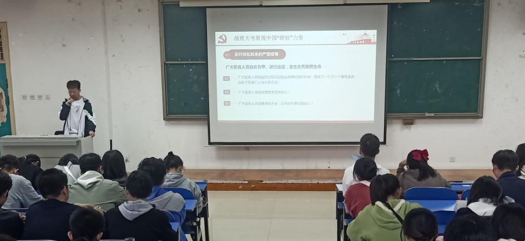 本次宣讲共分为战疫大考展现中国“硬核”力量、战疫实践铸就伟大抗疫精神、抗疫斗争斩获六大深刻启示和抗疫大课感悟中医传承精华四个部分。首先,时润泽同学以“以国之名,致敬抗疫英雄”为主题进行宣讲,带领大家重温抗疫期间最美逆行者的身影。然后,以动画短片形式生动展现了抗疫工作者的责任与担当。此外,他列举出一些优秀河中医学子不顾家人反对,毅然逆行支援武汉的感人事例。最后,时润泽同学以“抗疫大课感悟中医传承精华”讲述每一次病疫到来时,中医药都未曾缺席,这不仅增强了同学们对中医药文化的自信,也坚定了各位同学们奋斗的方向。至此,“医路传承精华,大考不辱使命”宣讲活动圆满结束。