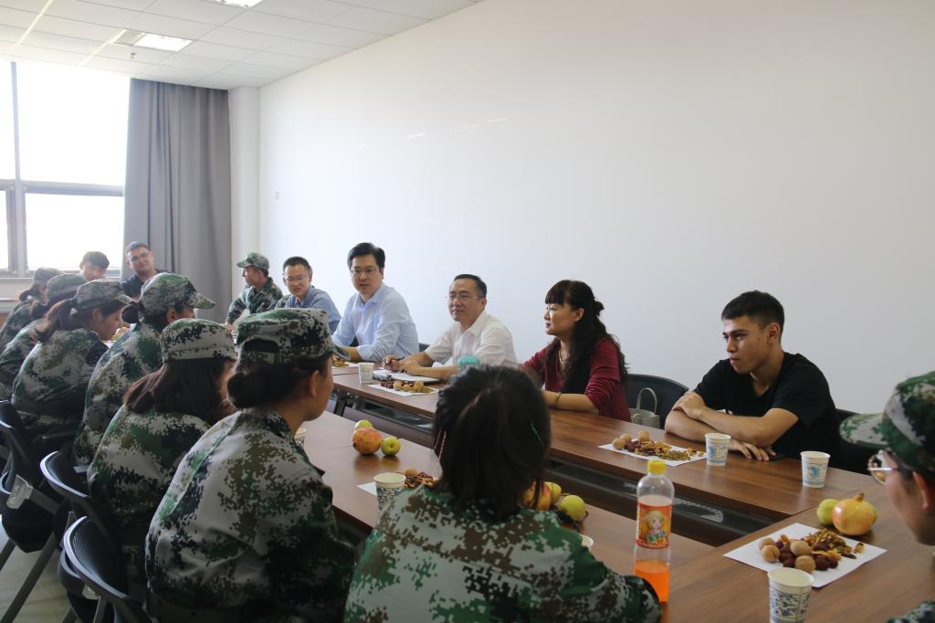 茶话会上,新疆同学热情地与大家分享核桃、大枣、酥梨等家乡特产,段晓鹏书记和庞亚宾副书记也带来枣干、石榴请同学们品尝。段晓鹏书记与同学们亲切交谈,表达了学院对预科班同学的关心,同时希望预科班同学要加强自身思想教育,自觉遵守国家法律和校规校纪。庞亚宾副书记肯定了同学们在军训中的优秀表现,鼓励同学们要坚持到底,勇于突破自我,要抓住军训机会尽快融入大学学习生活。张华老师着重强调了安全问题,提醒新疆同学请假要严格履行相关手续,外出时注意保护自身安全。