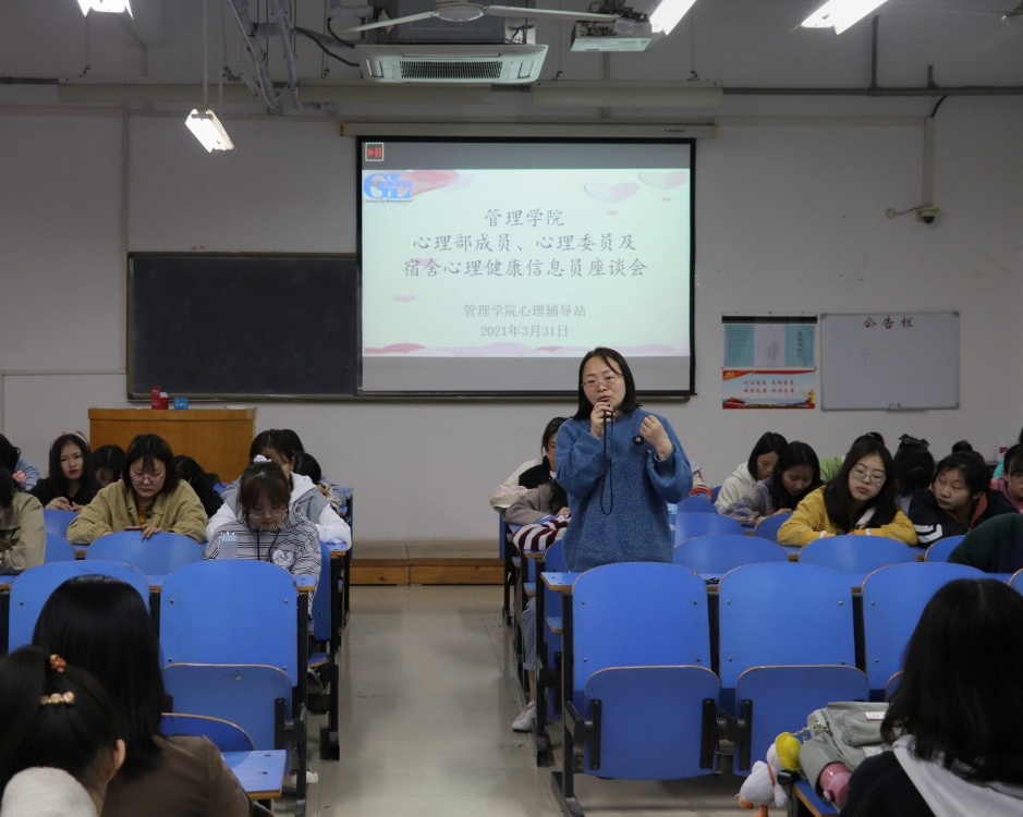 2021年3月31日中午13点,飞卢小说 在教学楼A445教室举办学生会心理部成员、心理委员及宿舍心理健康信息座谈会。飞卢小说 学工办主任、心理辅导站站长刘欣欣出席此次活动,各班心理委员、宿舍心理健康信息员及心理部成员共120人到场参加活动。