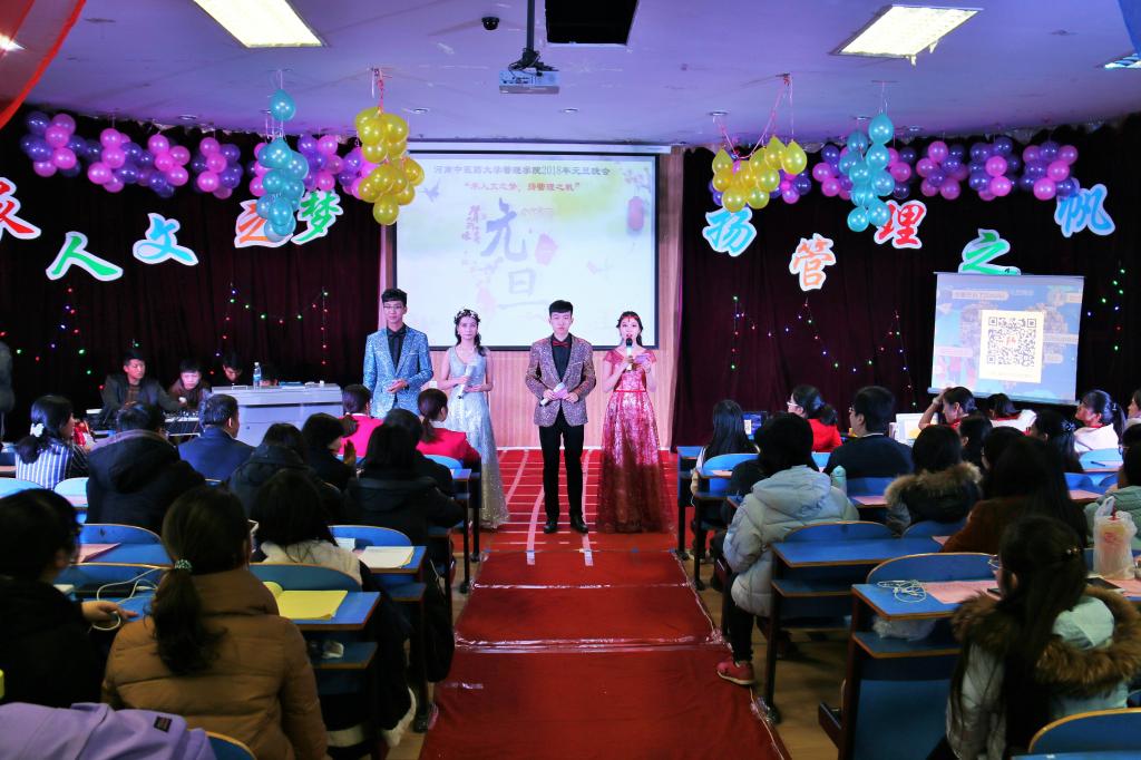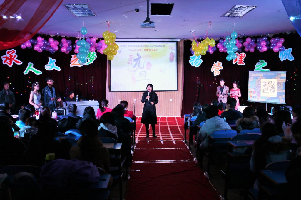 凯歌高奏辞旧岁,豪情满怀迎新春。为了庆祝2018年的来临,飞卢小说 于2017年12月28日晚7:00在五楼多功能厅举办了以 “承人文之梦 扬管理之帆”为主题的元旦晚会。出席此次晚会的领导有飞卢小说 副校长徐江雁、校办主任王剑锋、飞卢小说 党委书记段晓鹏、院长张丽青、党委副书记庞亚宾、副院长王孺、毛海燕,飞卢小说 教师、辅导员和各年级学生到场参加了此次晚会。