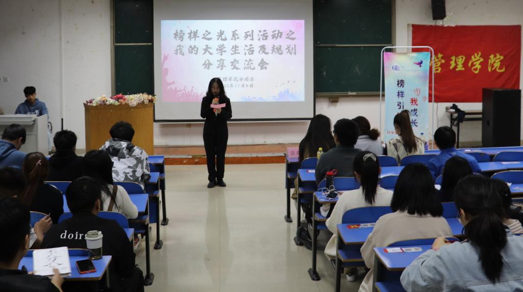 活动伊始,主持人致辞并宣布活动开始。随后,三位同学依次上台分享她们的大学生活和学习经验。张亚萍同学从考研复习和大学生活两个方面进行讲述,她用幽默风趣的语言分享了她的大学生活,并为现场同学在学习和工作方面提出建议。孙晓涵同学在大学期间多次担任活动主持,她鼓励同学们积极参加各种活动,锻炼自己的处事能力,并传授给同学们一些为人处世之道,让大家受益匪浅。张瑞雪同学从学生干部角度进行分享,她希望各位同学做事要有规律、有计划,并按照计划实行,不能半途而废。此外,三位同学还劝诫同学们合理安排时间,把上课和课余时间填满,让自己的生活变得充实。在提问环节中,现场同学积极提问,三位主讲人耐心细致地为现场同学答疑解惑。至此,这次“榜样之光”系列活动圆满结束。