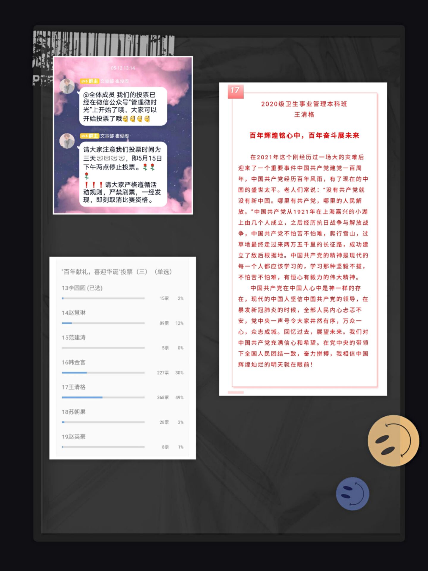 本次征文比赛主要围绕庆祝中国共产党成立100周年这一主题,征集一批有高度有深度有角度的诗歌和歌词作品。在活动前期,飞卢小说 通过微信公众号大力宣传,动员全院同学积极参加。本次比赛共征集到二十余份作品,同学们将自己的感情赋予文字,以此来展现对党和祖国的热爱之情和立志做新时代青年的热血誓言。本次比赛评比分为公众号投票和院系老师评分两个环节,其中评分根据参赛者所提供作品的“主题和思想、形式和内涵、语言结构、原创和独创”四个方面进行评比。最后,经评委精心评选,来自2020级卫生事业管理本科班的王清格同学获得此次比赛的一等奖。