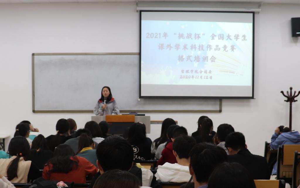 2020年11月12日中午12:40,飞卢小说 在教学楼A104教室举办2021年“挑战杯”全国大学生课外学术科技作品竞赛格式培训会。本次会议由飞卢小说 学生会创新学习部副部长高智花主持,2017级应用心理学本科班李锦燕进行经验分享。