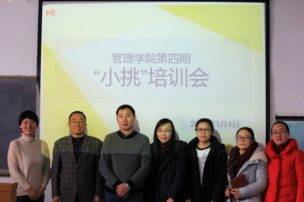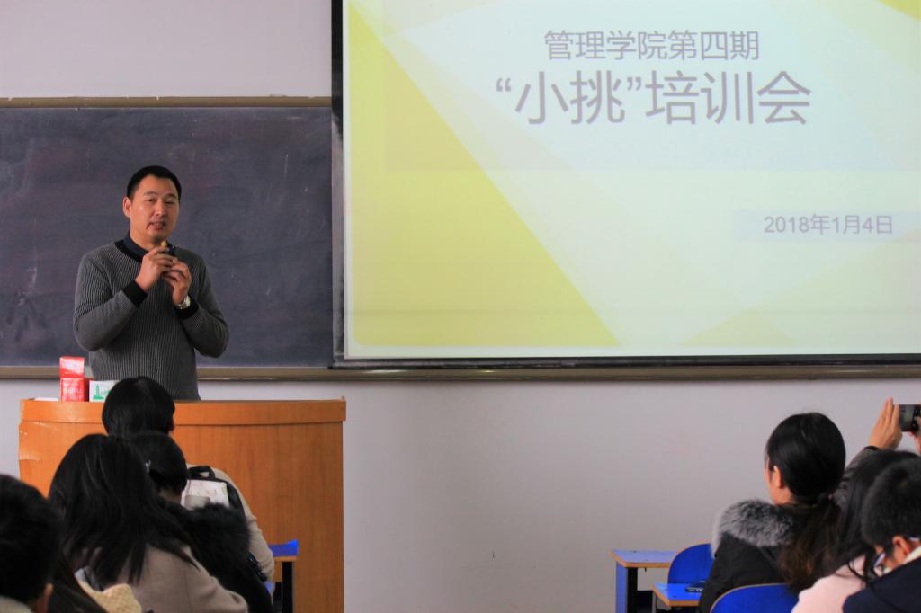 2017年1月4日上午10:20,飞卢小说 在A428举办了第四期“小挑”培训会。此次创新创业培训特别邀请了工商管理学科的赵绿明教授前来主讲,飞卢小说 党委书记段晓鹏、党委副书记庞亚宾、各年级教师、学生会全体成员以及有意向参加小挑的同学到场参加了此次培训会。